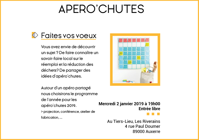 Participer à la programmation 2019 des apéro'chutes ! Vous avez envie de découvrir un sujet ? De faire connaître un savoir-faire local sur le réemploi et la réduction des déchets? De partager des idées d’apéro’chutes. Autour d’un apéro partagé nous choisirons le programme de l’année pour les apéro’chutes 2019. > projection, conférence, atelier de fabrication, ...