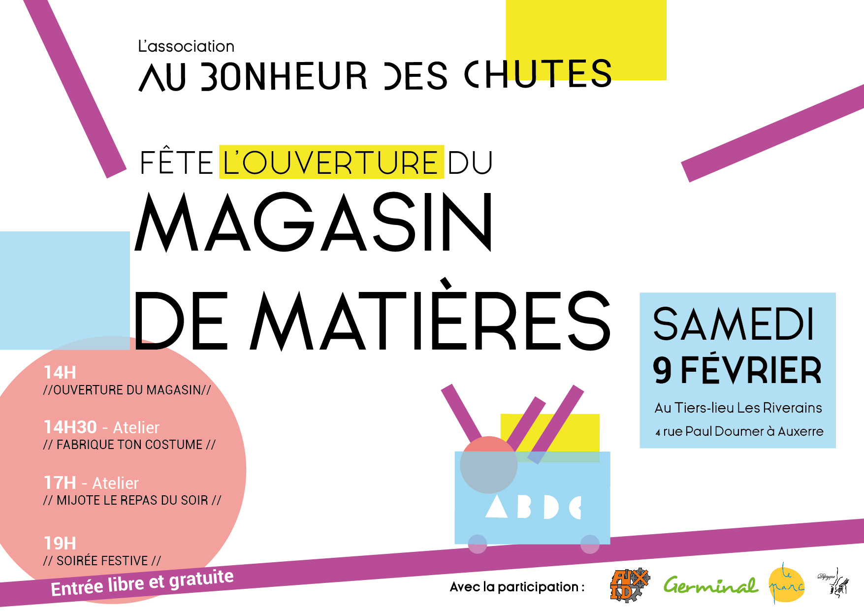 Rendez-vous le samedi 9 février à partir de 14h au tiers-lieu Les Riverains à Auxerre. Au Bonheur des Chutes fête l’ouverture officielle du magasin de matières. Située dans le tiers-lieu Les Riverains à Auxerre, cet espace est dédié à la vente de matières délaissées collectées auprès des entreprises locales. Ouverte à tous, chacun pourra y venir acheter bois, textile, métal, …...